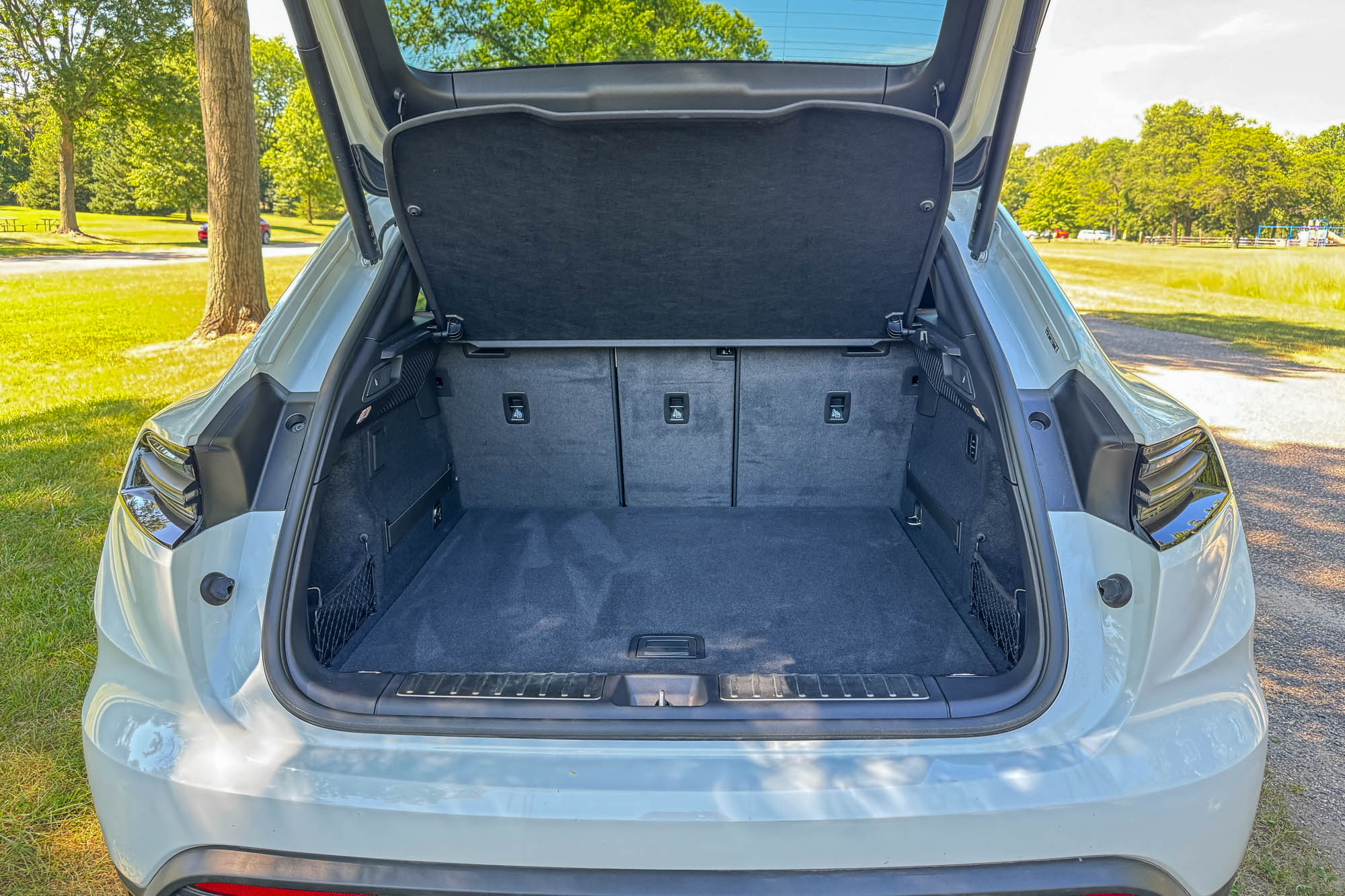 Cargo space ends up about even between old and new. You get 18 cubic feet of space behind the second row, 47 cubic feet with it folded. That said, without an engine in the way, Porsche provided 2.9 cubic feet of frunk space to enjoy. It looks large enough to swallow a carry-on case with little trouble.