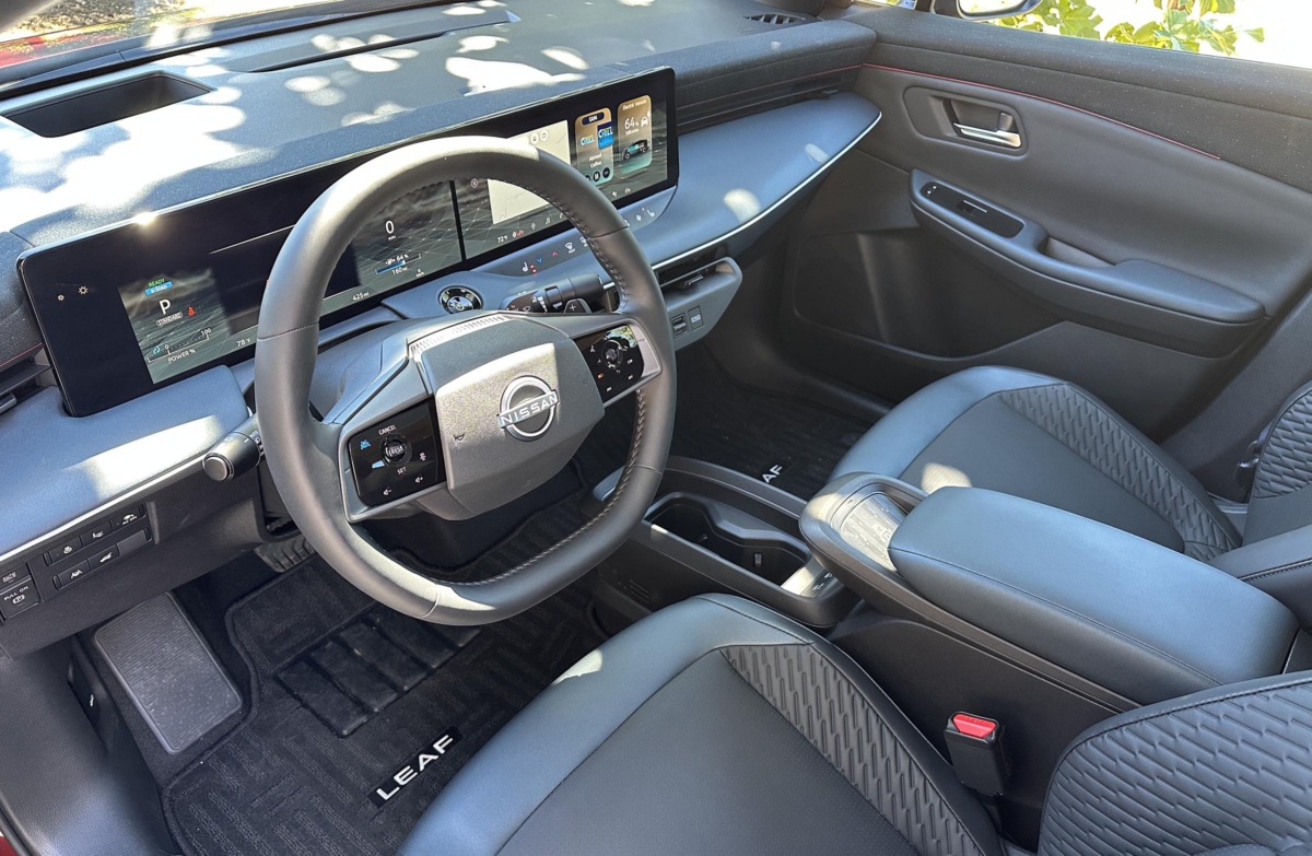 For 2026, Leaf gets a much more modern cabin, among other things, offering twin 14.3-inch displays, depending upon the package and option choices. There's a separate grouping of climate controls, a welcome feature in a world where many automakers are determined to make motorists struggle through inscrutable touchscreen layers, even to operate mirrors and, gasp, vents.