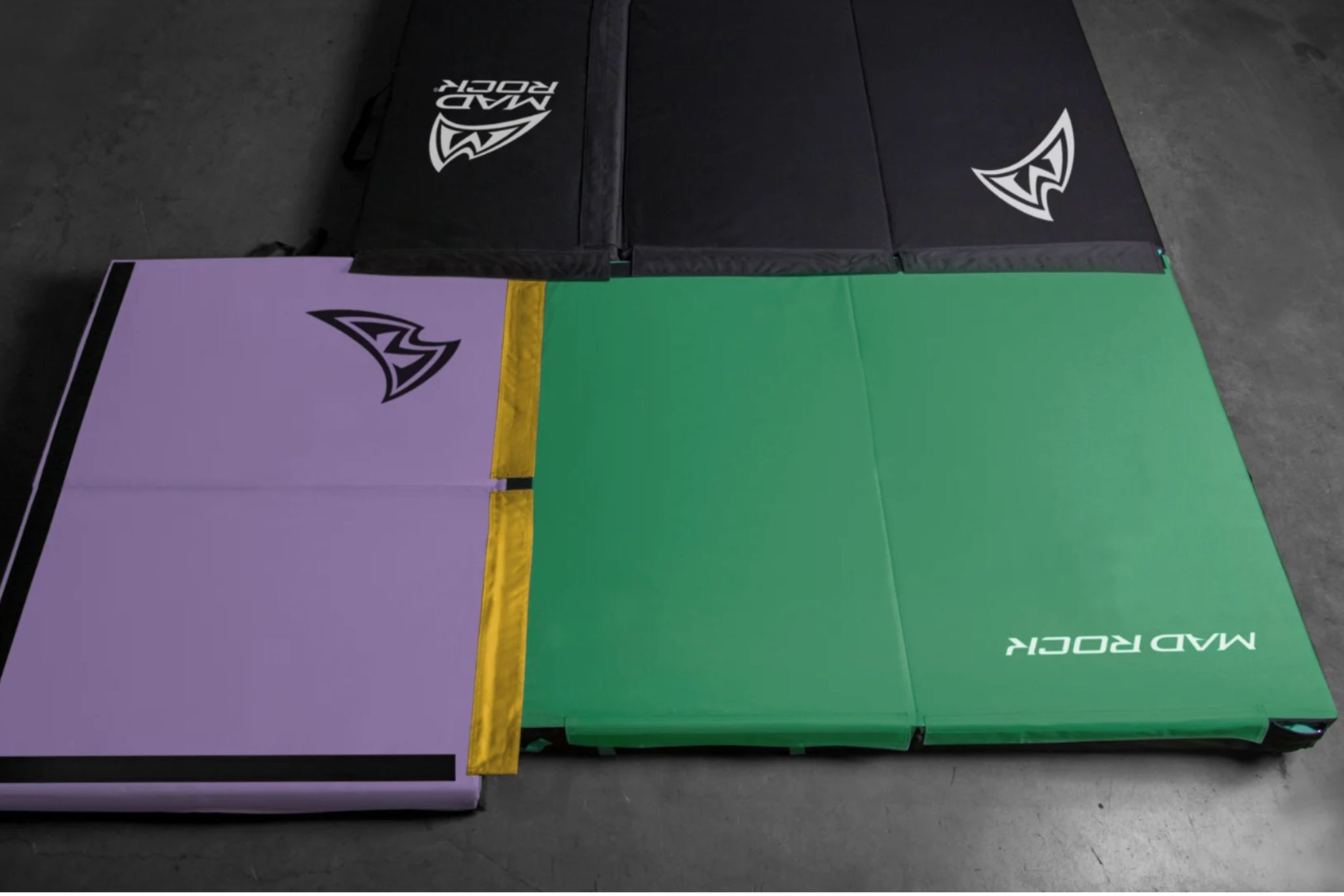 Black, teal, and purple crash pad on the ground