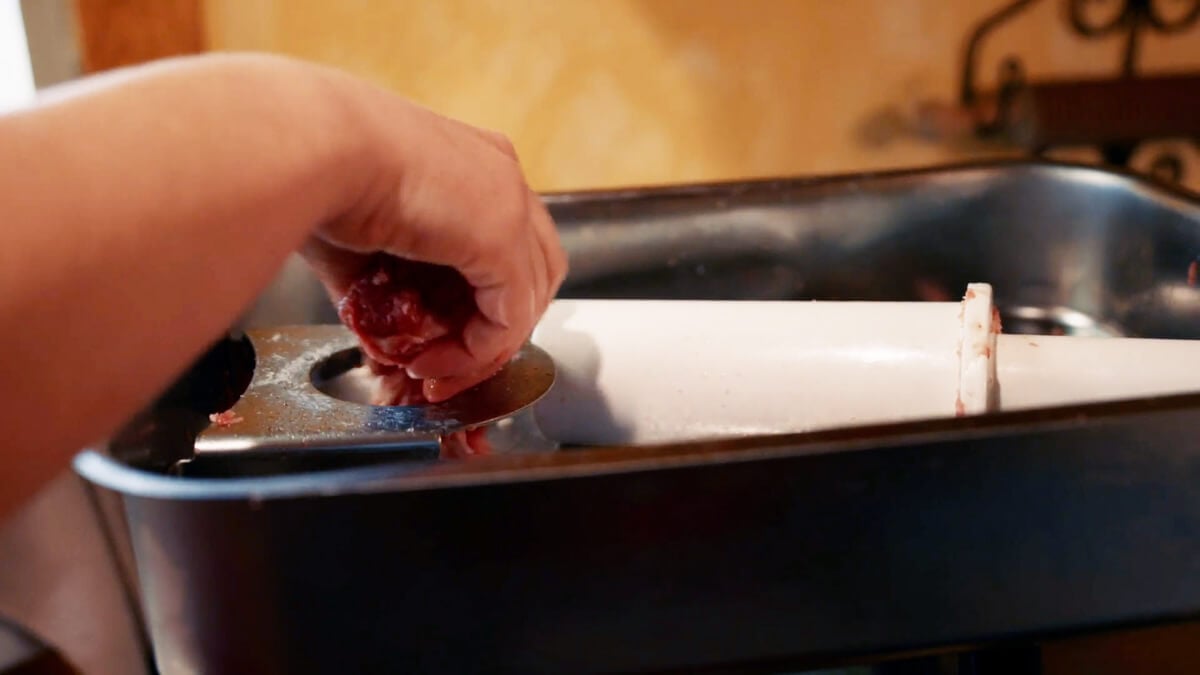 • Tie a knot at the end of the casing and begin filling the casings with the ground meat.
