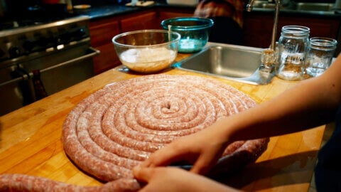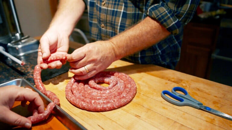 https://homesteadingfamily.com/wp-content/uploads/2025/01/Twisting-into-Sausage-Links_HF-1024x576.jpg" alt="Ground Pork breakfast sausage being fed into pork casings." class="wp-image-40296" srcset="https://homesteadingfamily.com/wp-content/uploads/2025/01/Twisting-into-Sausage-Links_HF-1024x576.jpg 1024w, https://homesteadingfamily.com/wp-content/uploads/2025/01/Twisting-into-Sausage-Links_HF-300x169.jpg 300w, https://homesteadingfamily.com/wp-content/uploads/2025/01/Twisting-into-Sausage-Links_HF-768x432.jpg 768w, https://homesteadingfamily.com/wp-content/uploads/2025/01/Twisting-into-Sausage-Links_HF-480x270.jpg 480w, https://homesteadingfamily.com/wp-content/uploads/2025/01/Twisting-into-Sausage-Links_HF.jpg 1200w" sizes="(max-width: 1024px) 100vw, 1024px" data-pin-media="https://homesteadingfamily.com/wp-content/uploads/2025/01/Twisting-into-Sausage-Links_HF.jpg">
