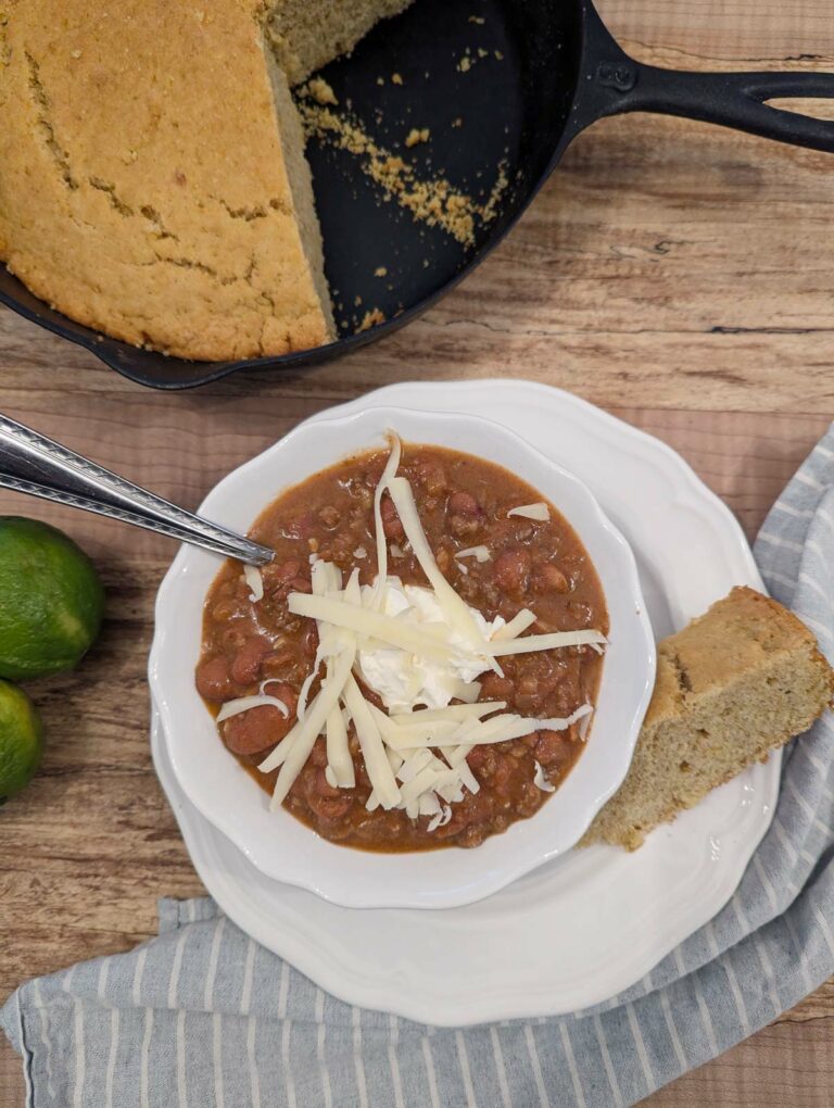 https://melissaknorris.com/wp-content/uploads/2025/03/Bowl-of-Chili-with-Cornbread_MKN-771x1024.jpg" alt="Homemade chili in a white bowl with a slice of cornbread." class="wp-image-50661" srcset="https://melissaknorris.com/wp-content/uploads/2025/03/Bowl-of-Chili-with-Cornbread_MKN-226x300.jpg 226w, https://melissaknorris.com/wp-content/uploads/2025/03/Bowl-of-Chili-with-Cornbread_MKN-600x797.jpg 600w, https://melissaknorris.com/wp-content/uploads/2025/03/Bowl-of-Chili-with-Cornbread_MKN-768x1020.jpg 768w, https://melissaknorris.com/wp-content/uploads/2025/03/Bowl-of-Chili-with-Cornbread_MKN-771x1024.jpg 771w, https://melissaknorris.com/wp-content/uploads/2025/03/Bowl-of-Chili-with-Cornbread_MKN-1156x1536.jpg 1156w, https://melissaknorris.com/wp-content/uploads/2025/03/Bowl-of-Chili-with-Cornbread_MKN.jpg 1200w" sizes="auto, (max-width: 771px) 100vw, 771px" />