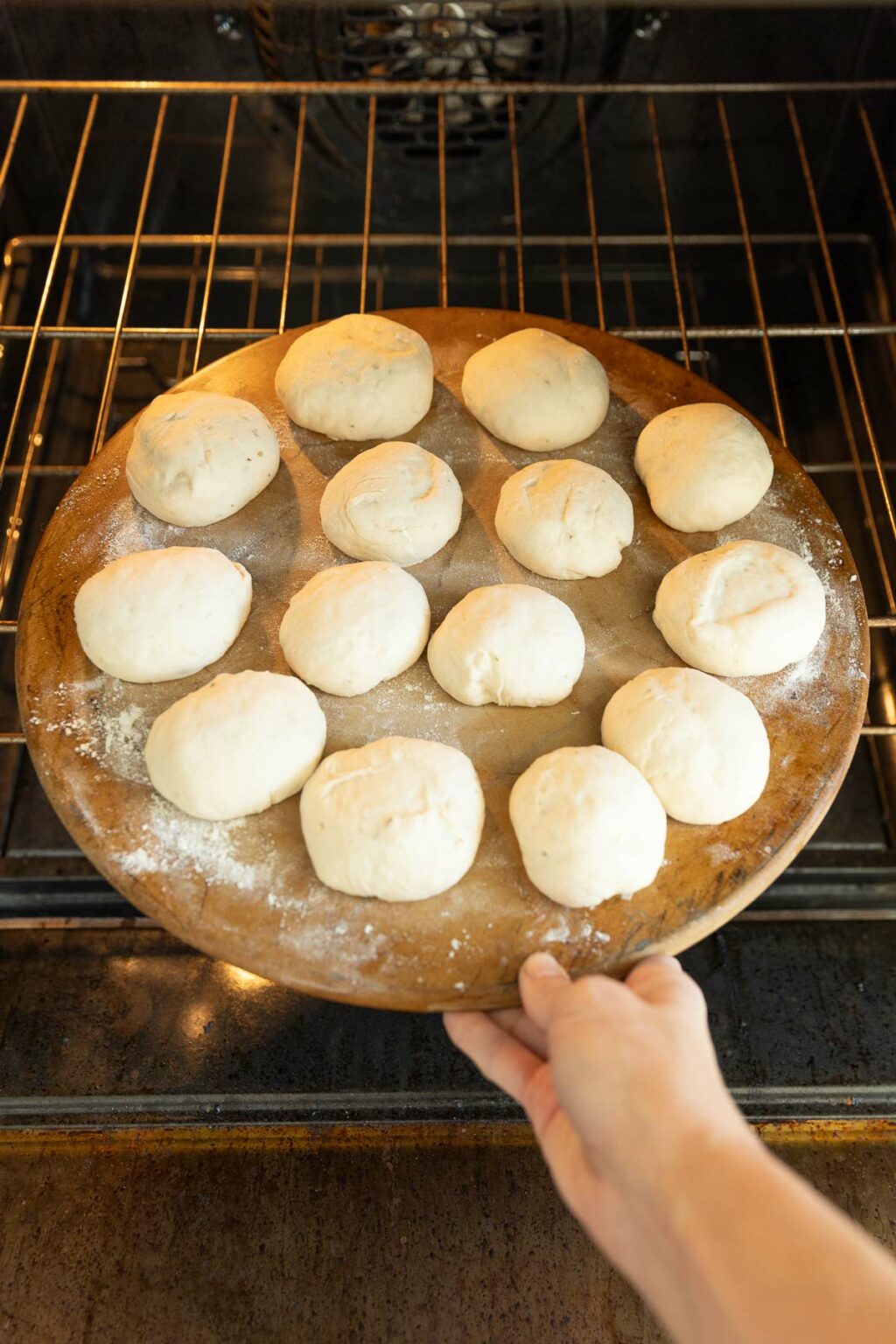 The dough is ready when it has doubled in size and feels light. If a finger indentation stays, it's ready to shape.