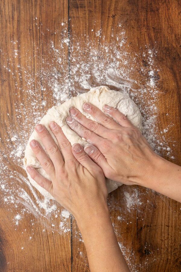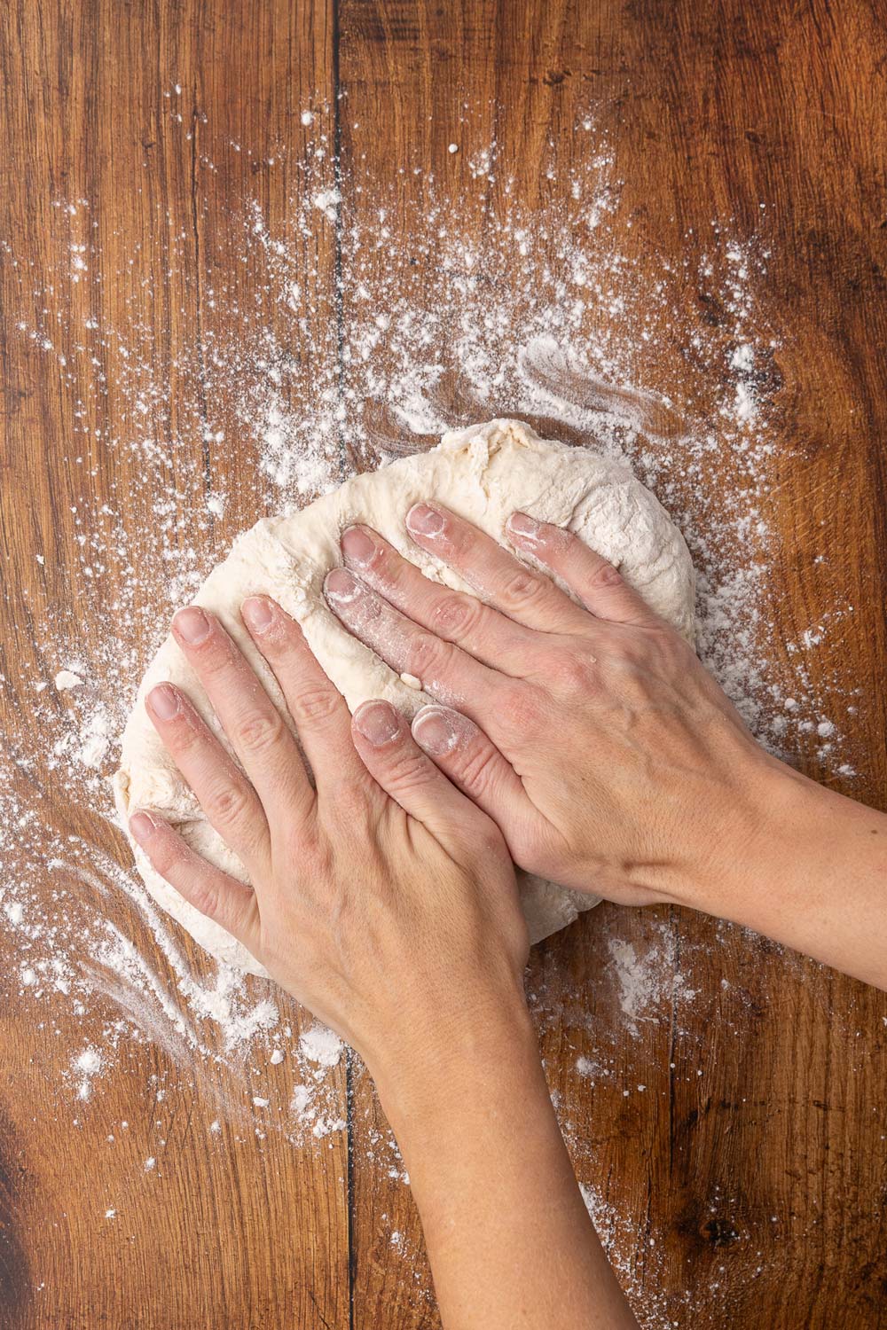 • If using a stand mixer, knead the dough for 5 minutes with a dough hook. Otherwise, pour the dough out onto a floured surface and hand-knead for 5 minutes.