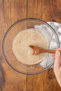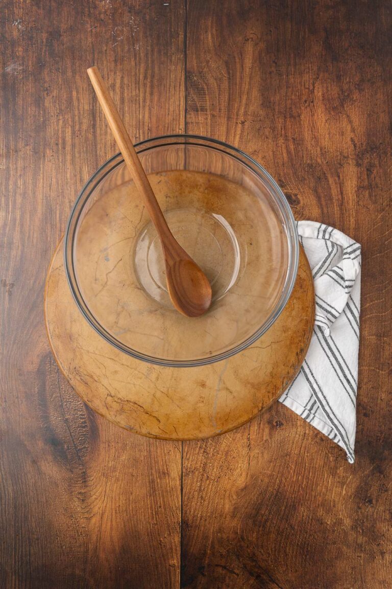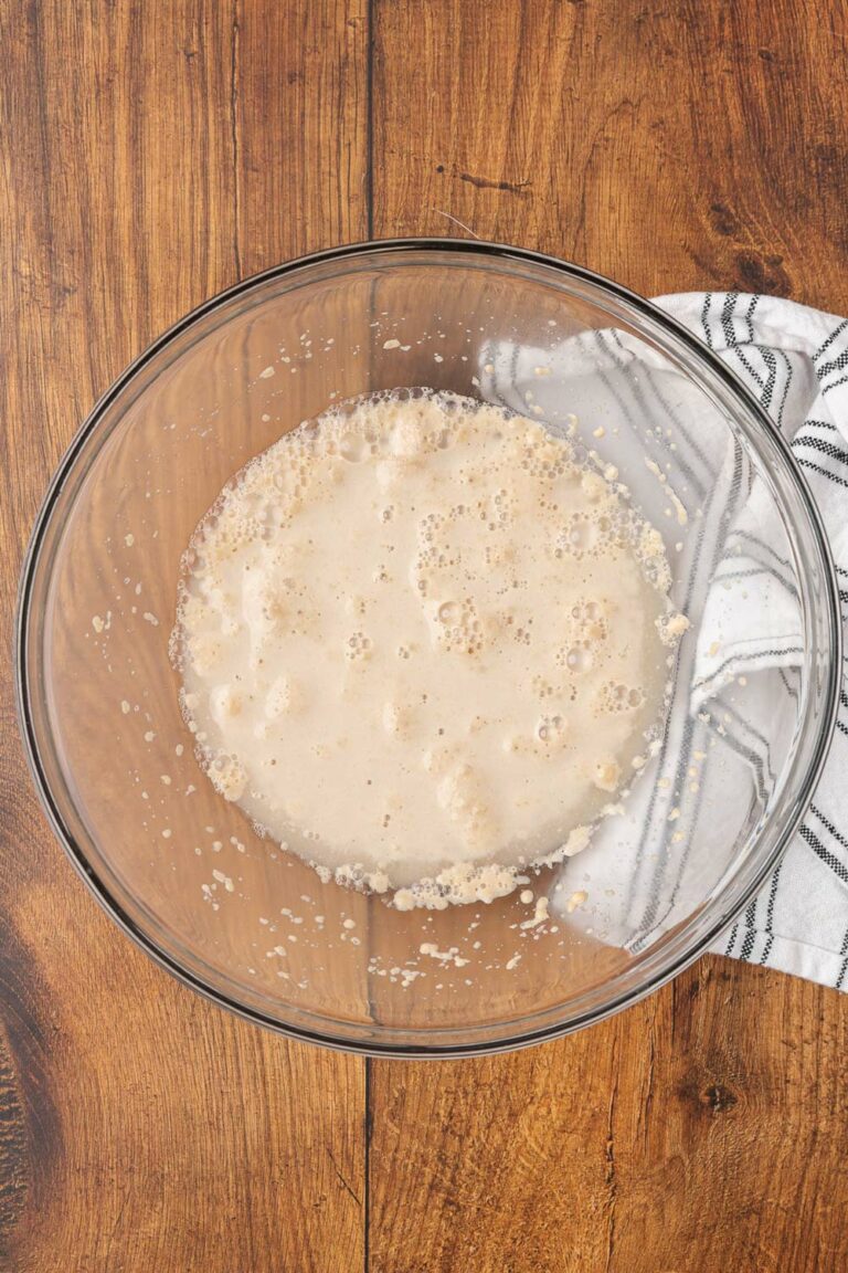 • Stir water, yeast, and sugar together. Leave for a few minutes until it becomes bubbly and frothy on top.