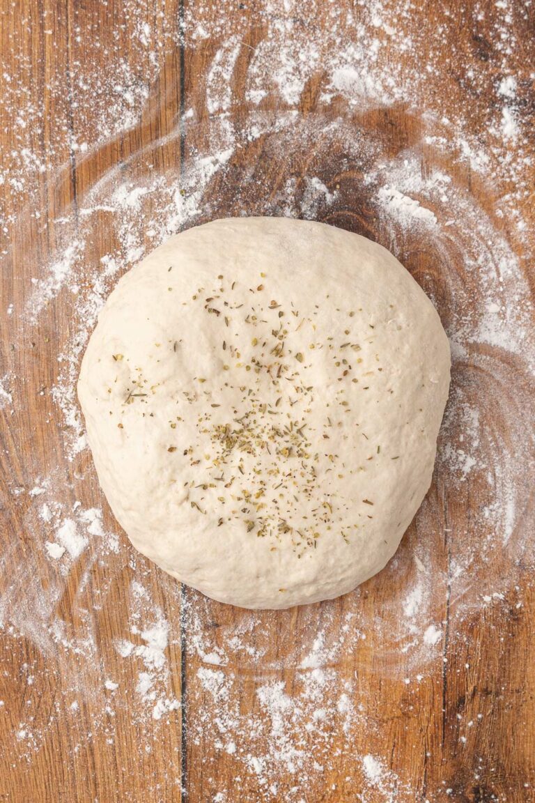 4. Form half of the dough into a loaf. Sprinkle the optional herb mixture of your choice onto the dough and knead until mixed.