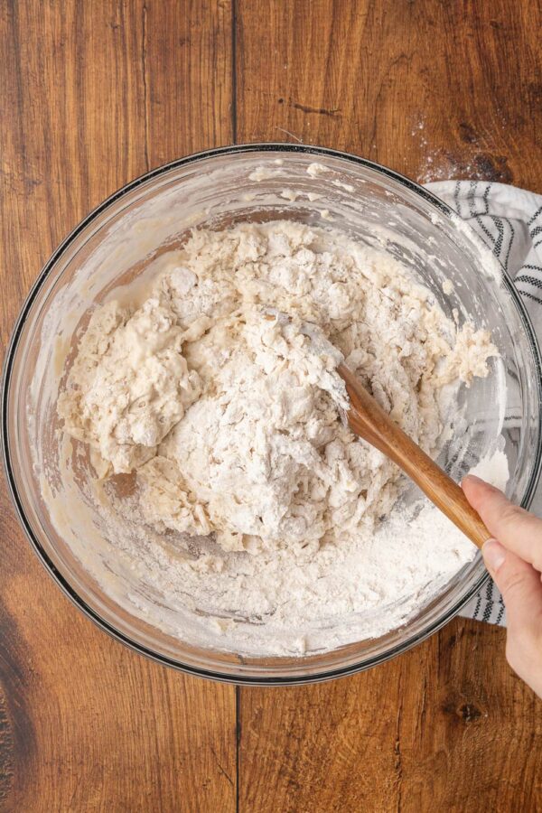 3. If using a stand mixer, knead the dough for 5 minutes with a dough hook. Otherwise, pour the dough out onto a floured surface and hand-knead for 5 minutes.